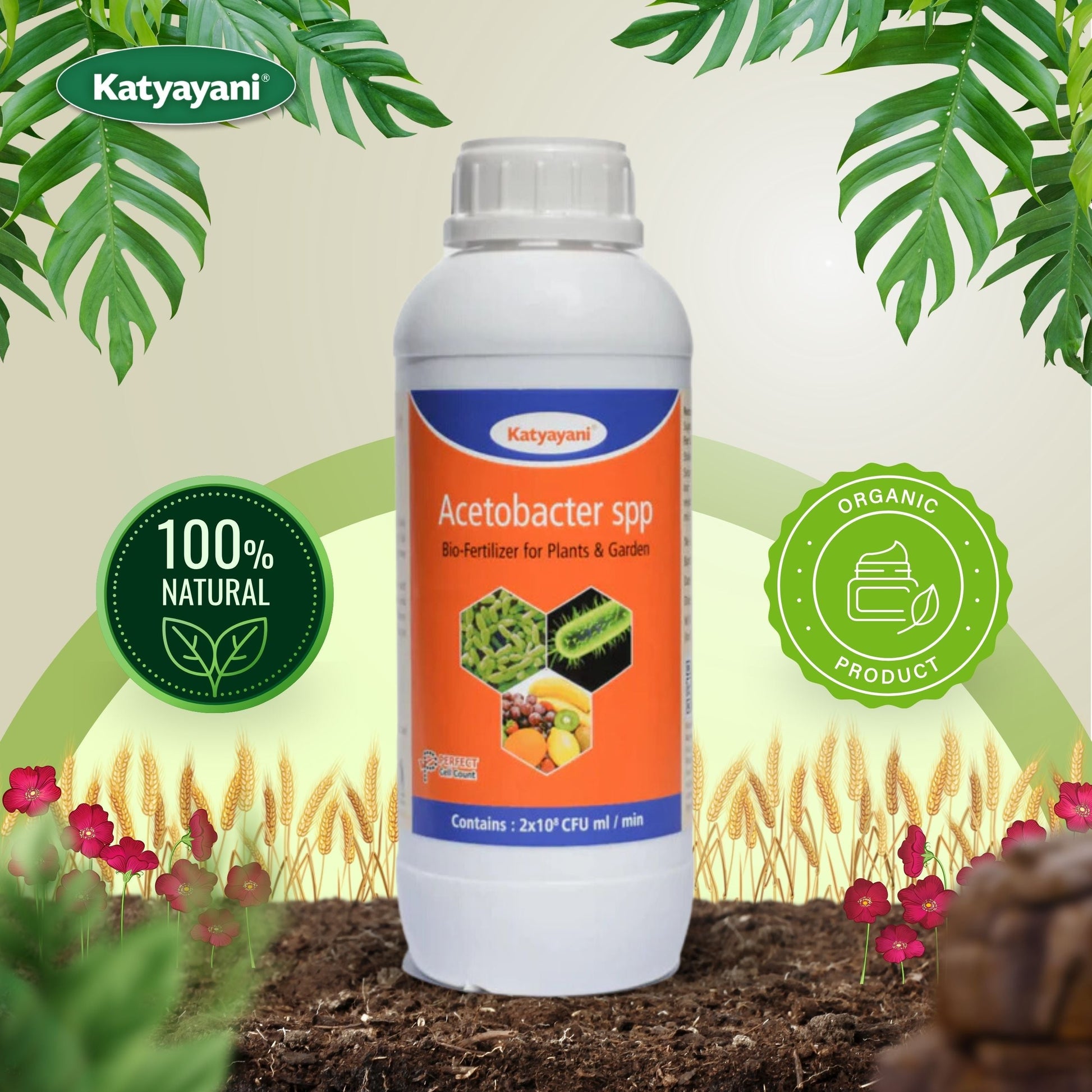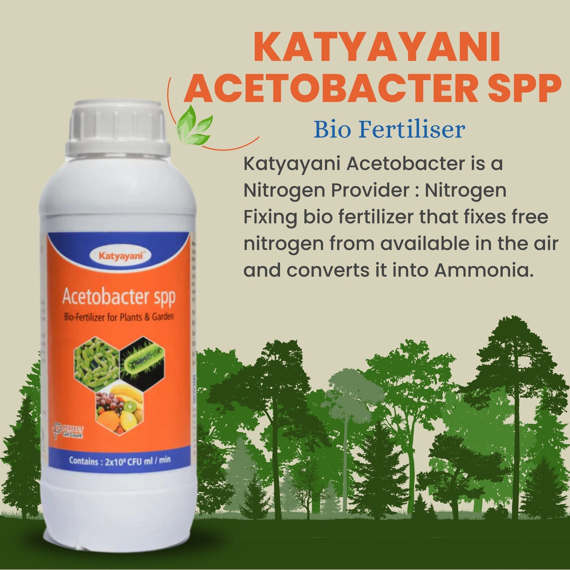 Ammonia.Hence it naturally gives the plant Nitrogen without use of Artificial Fertilizer. - Katyayani Acetobacter is a powerful liquid solution with Recommended CFU ( 5 x 10^8 ) thus powerful liquid Solution and better Shelf life