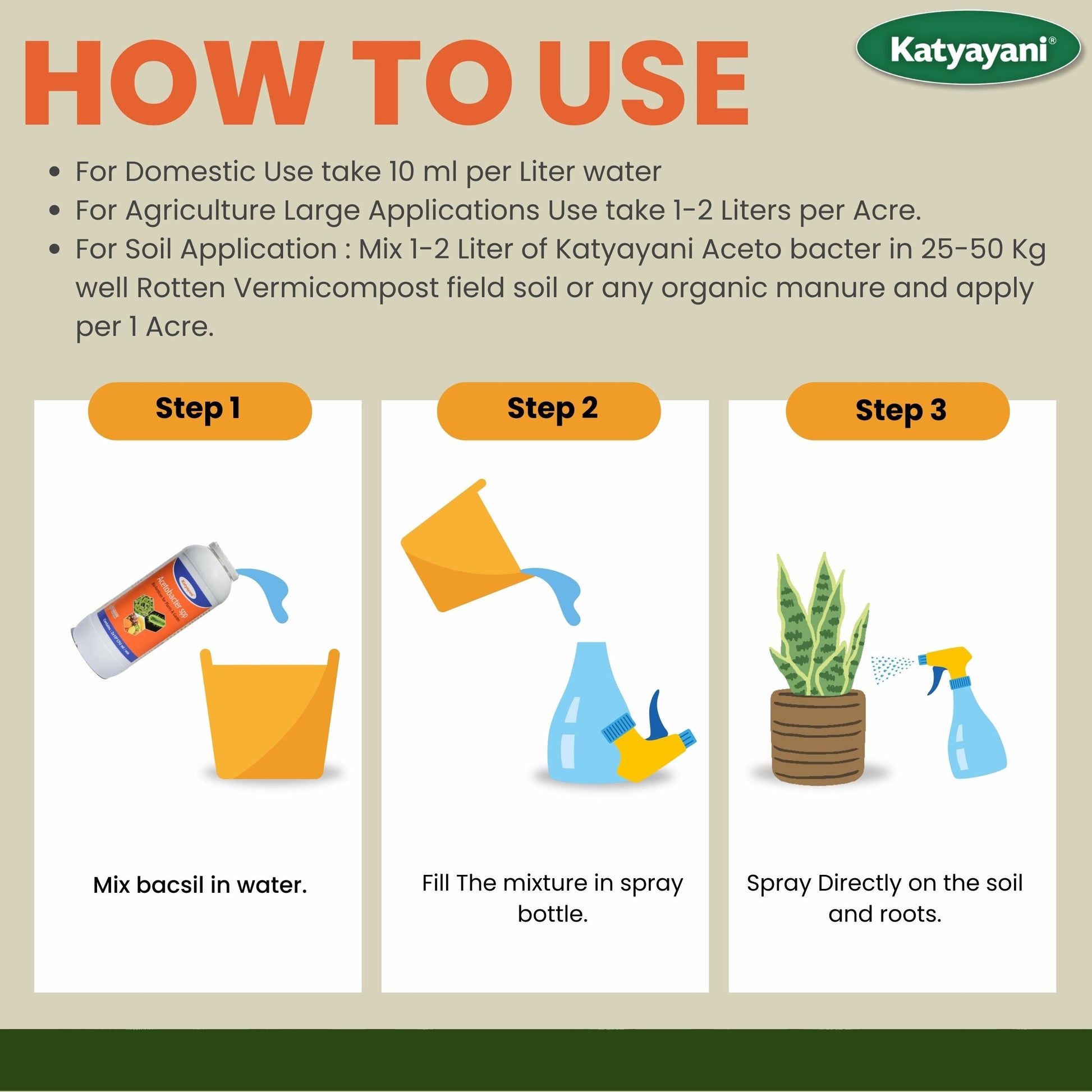 Application : Mix 1-2 Liter of Katyayani Aceto bacter in 25-50 Kg well Rotten FYM / Compost / Vermicompost field soil or any organic