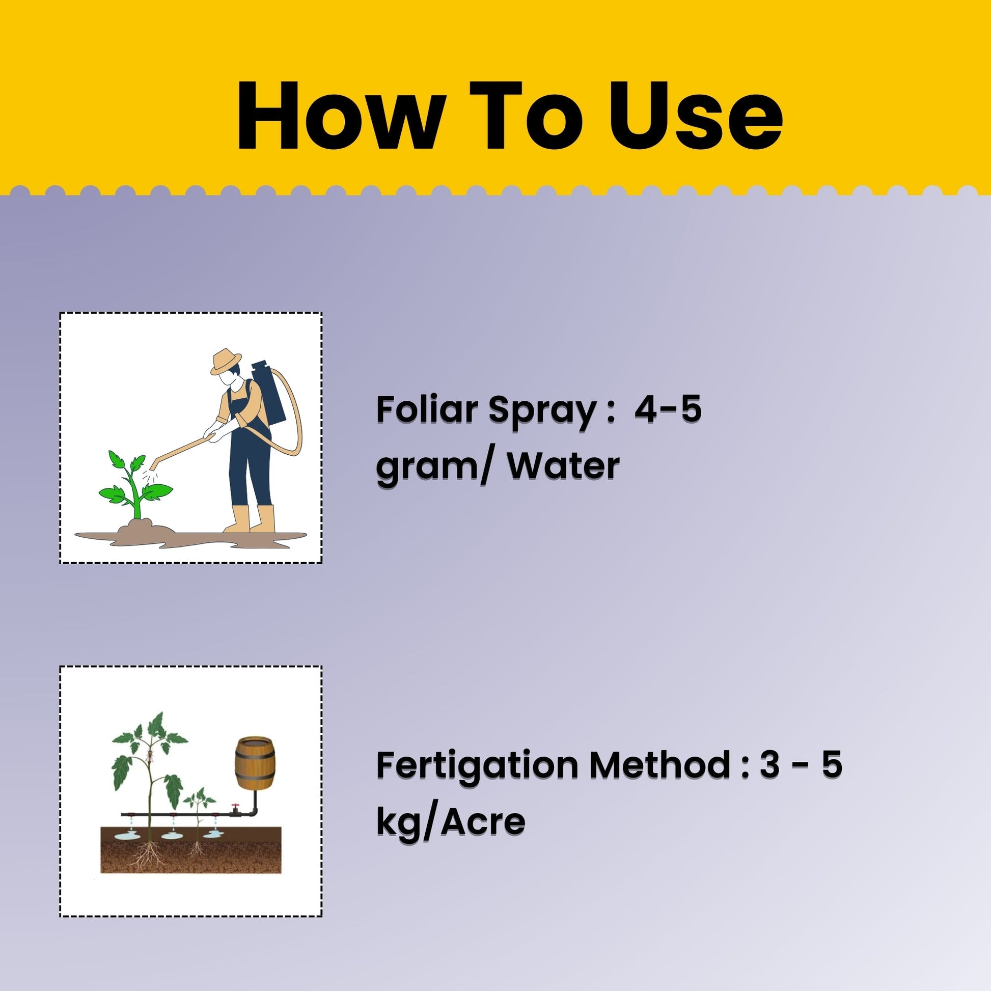 - Fertigation (General): For fertigation, the recommended dosage is 1-3 kilograms per acre. However, it's important to use the dosage based on the results of soil analysis, the specific crop being grown, and its growth stage.